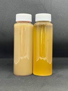 写真左:エマルジョンブレーカ―#200添加前 写真右:エマルジョンブレーカ―#200添加し撹拌後