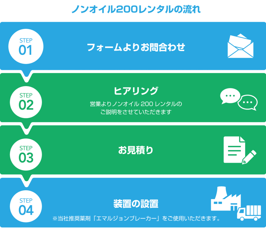 廃水処理設備の導入にあたって、設備費用の捻出や処理方法などお悩みのご意見をいただいております。 そこで、ご要望にお応えするために、装置レンタルを始めました。